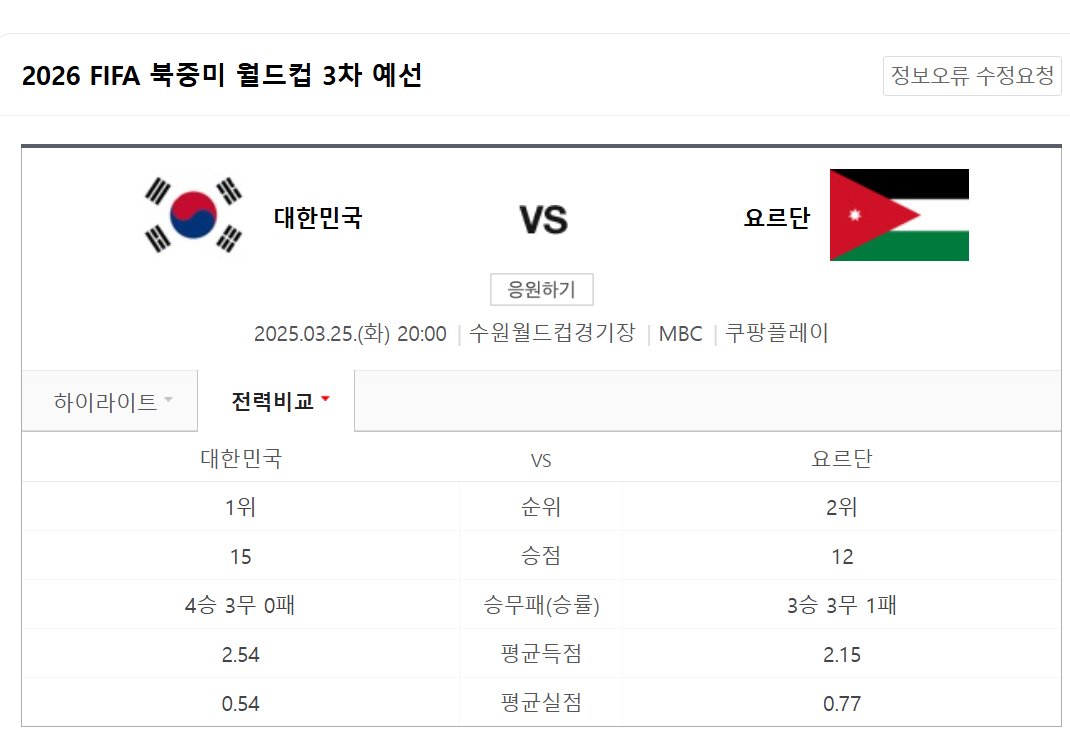 한국 축구대표팀은 2025년 3월 25일 오후 8시 수원월드컵경기장에서 요르단과 2026 FIFA 북중미 월드컵 아시아지역 3차 예선 경기를 치릅니다. 이 경기는 MBC와 쿠팡플레이에서 생중계될 예정이니, 놓치지 마시고 시청하시기 바랍니다.