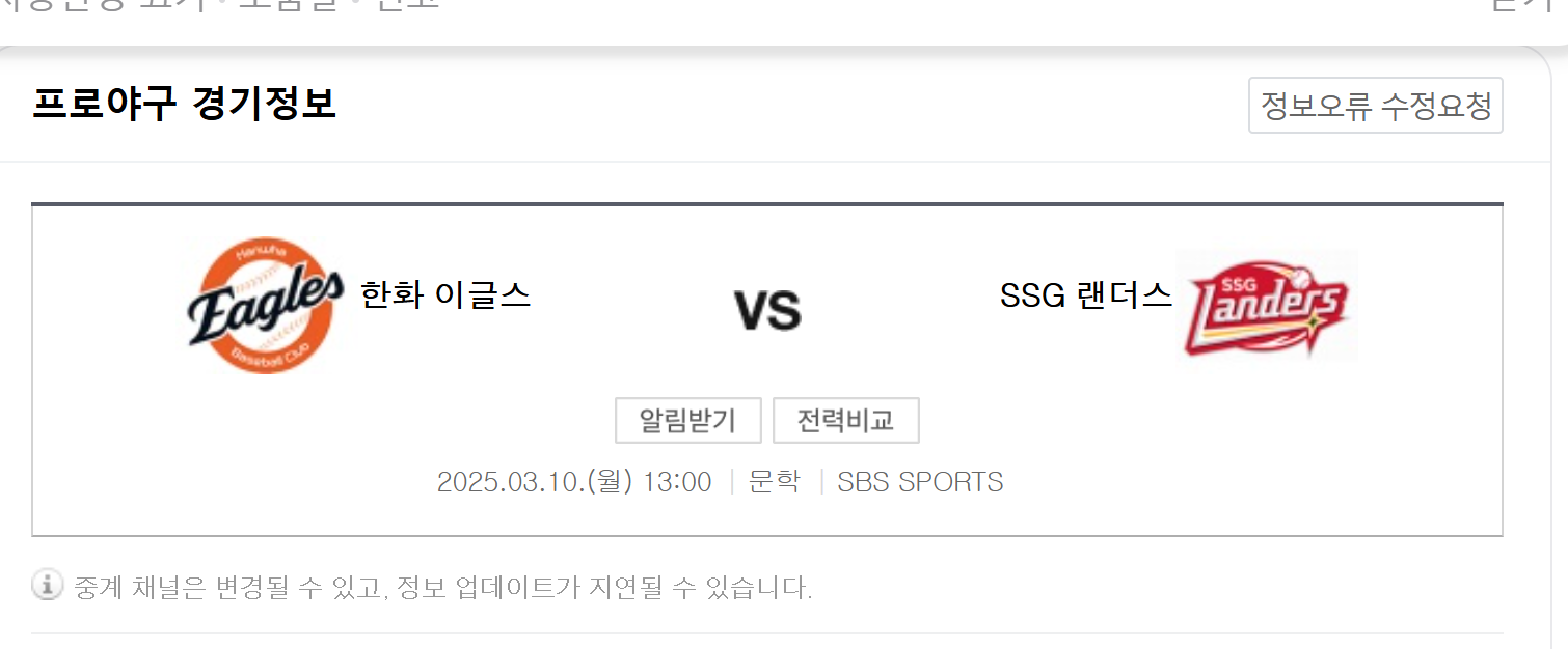 | 3월 15일(토) | 오후 1시 | 한화 이글스 vs. SSG 랜더스 | 대전구장 |